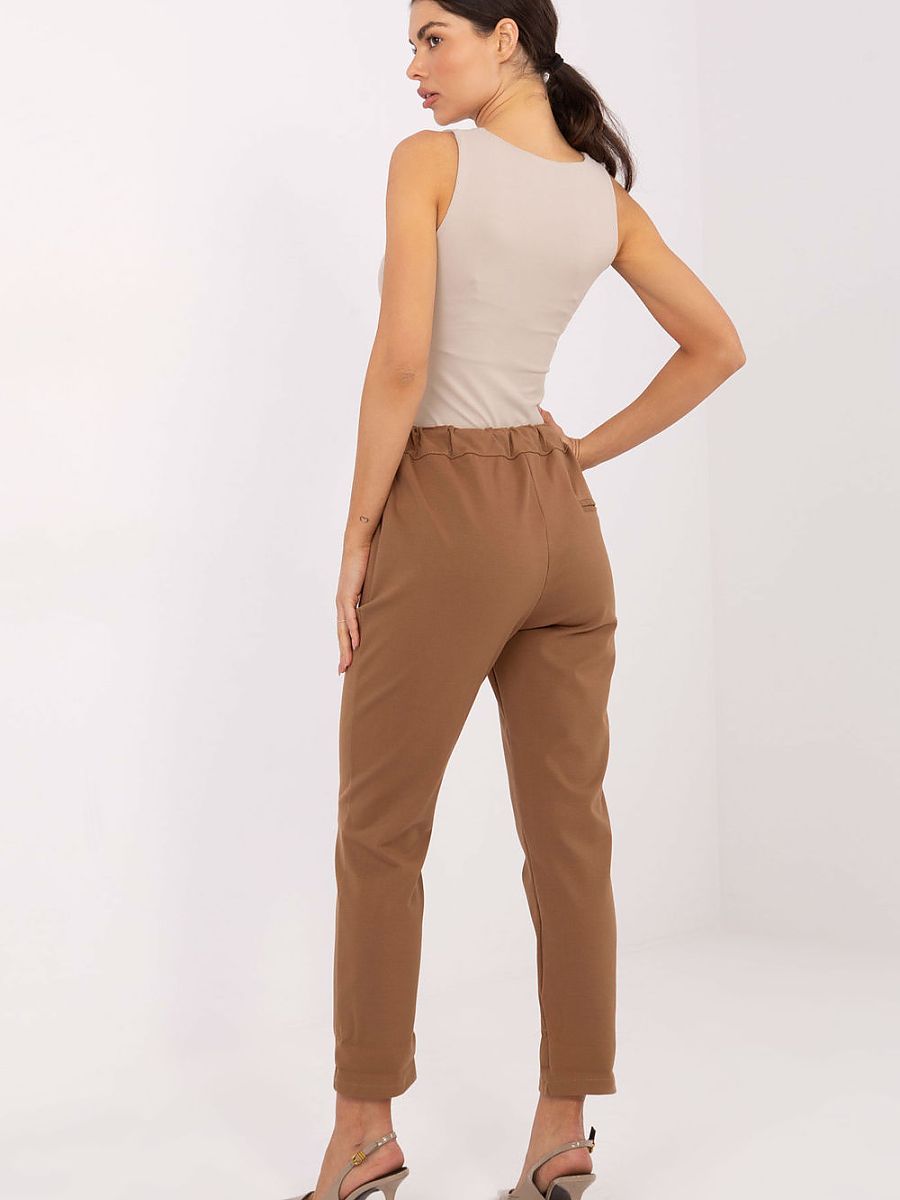Women’s casual fabric trousers are a comfortable and versatile option for everyday wear. Made from a high-quality blend of cotton, elastane, and nylon, they provide comfort, flexibility, and durability. The smooth fabric gives them a timeless character that is easy to match with various styles. The high-waisted model beautifully accentuates the waist and ensures a comfortable fit. The tapered 7/8 length legs give the trousers a modern look and visually elongate the silhouette. The waist tie allows for individual adjustment, and practical side pockets increase functionality. The trousers are perfect for everyday outfits, whether paired with a blouse, sweater, or sporty top.