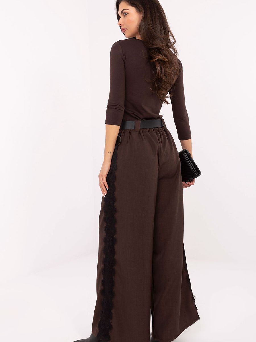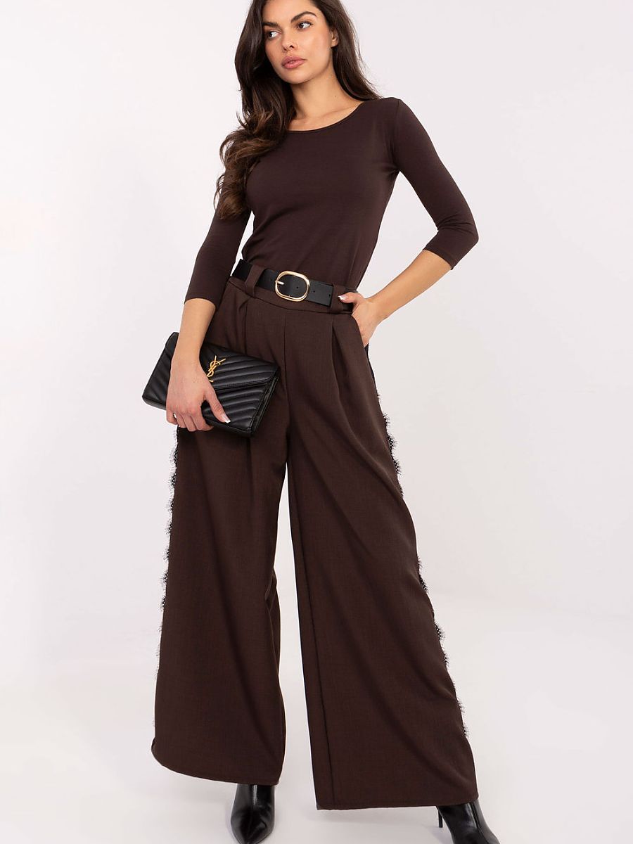 Elegant women’s material trousers are a combination of comfort and stylish look, perfect for everyday styling and work. The smooth pattern model makes it easy to combine trousers with various tops, creating both casual and more elegant outfits. The trousers have a high waist with an elastic band, which ensures comfort and a perfect fit to the silhouette. Wide legs guarantee wearing comfort, and side, slip-in pockets add practicality. Additionally, the model is equipped with a fastened belt and subtle lace sewn along the legs, giving the trousers a unique, feminine character. Made of high-quality blend of viscose and elastane, the trousers are soft, flexible, and durable, providing comfort throughout the day. It is the perfect choice for women who appreciate elegance combined with comfort and original details.