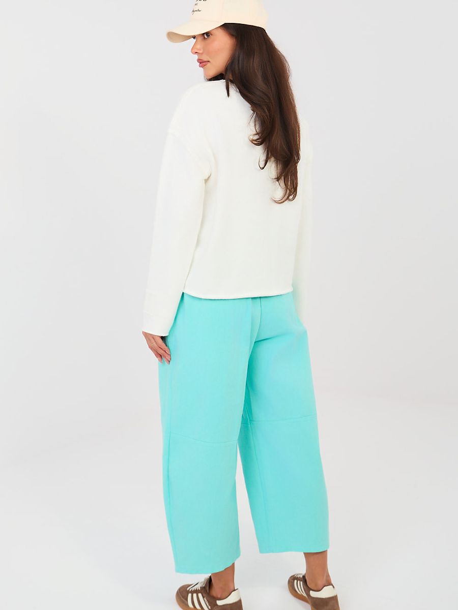 Fashionable women’s wide leg jeans that combine comfort with modern style. Made of high quality cotton with a hint of elastane, they guarantee comfortable wear and freedom of movement throughout the day. The model has a high waist and an elastic band sewn into the waist, which perfectly adjusts to the silhouette without the need for fastening. Pleats at the front add elegance and visually slim the legs. Wide legs emphasize the fashionable character of the trousers and provide lightness to the styling. The trousers are equipped with side pockets and a fastening belt, which is a practical and stylish addition. The smooth pattern makes the model perfect for both everyday stylings and casual workwear. Universal, comfortable, and stylish – an ideal base for many outfits.