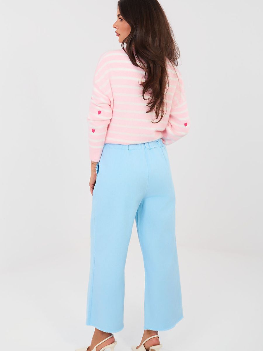 Casual women’s wide leg trousers are a comfortable and stylish option for everyday wear and work. Made of high-quality cotton with added elastane, they provide comfort, flexibility, and a good fit to the silhouette. The smooth pattern and high waist of the model beautifully emphasize the waist, and the elastic waistband guarantees comfort and freedom of movement. Wide legs with a stylish fray at the end give the trousers a fashionable, modern character. The trousers do not have a fastening, which further increases the comfort of use. Practical side pockets increase the functionality of the model. Perfect for everyday styling with a shirt, blouse, or sweater.