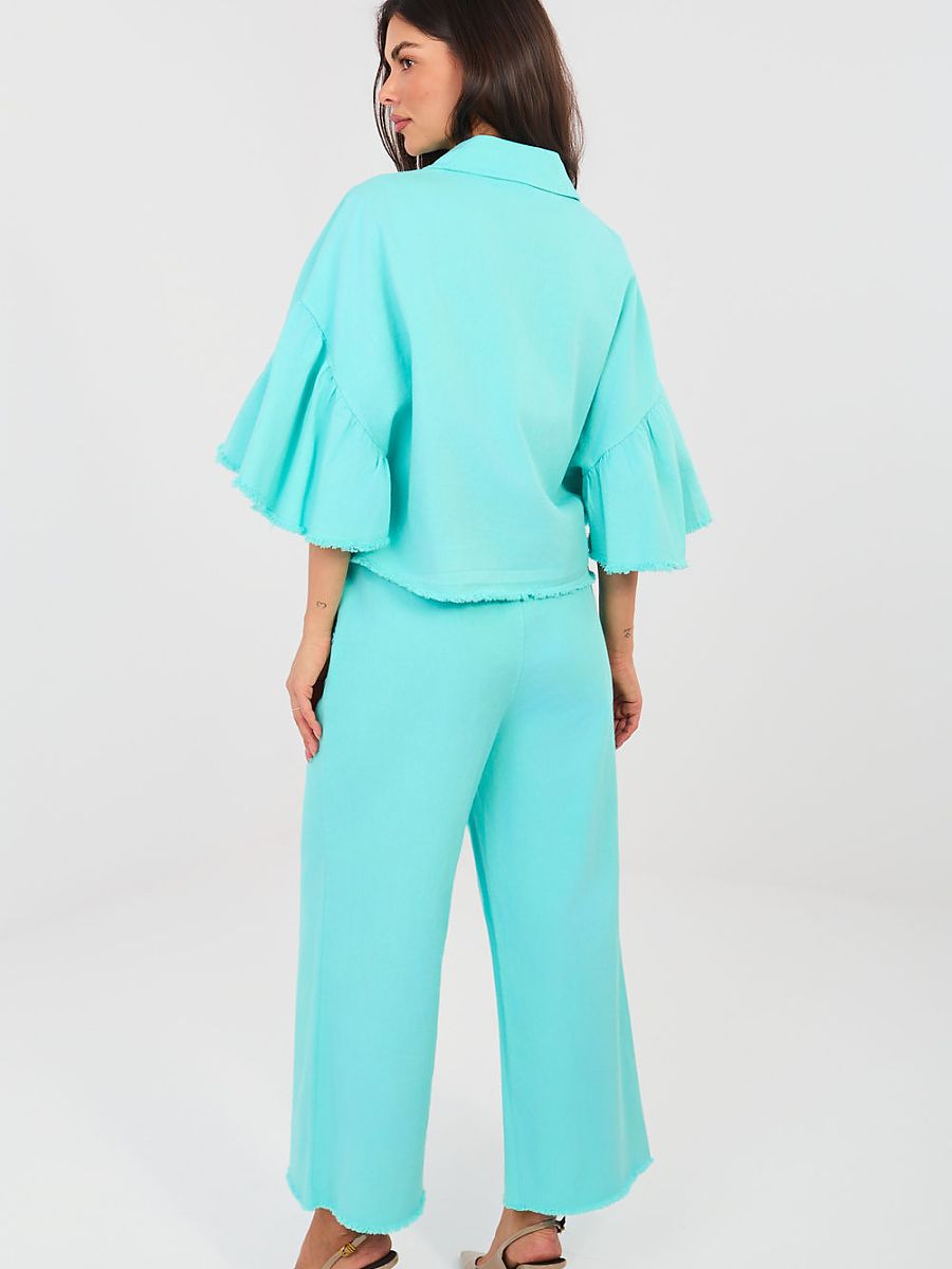Casual women’s wide leg trousers are a comfortable and stylish option for everyday wear and work. Made of high-quality cotton with a touch of elastane, they provide comfort, flexibility, and a good fit to the silhouette. The smooth pattern and high waist of the model beautifully emphasize the waist, while the elastic waistband ensures comfort and freedom of movement. The wide legs finished with a stylish fray give the trousers a fashionable, modern character. The trousers do not have a fastening, which further increases the comfort of use. Practical side pockets enhance the functionality of the model. Perfect for everyday styling with a shirt, blouse, or sweater.