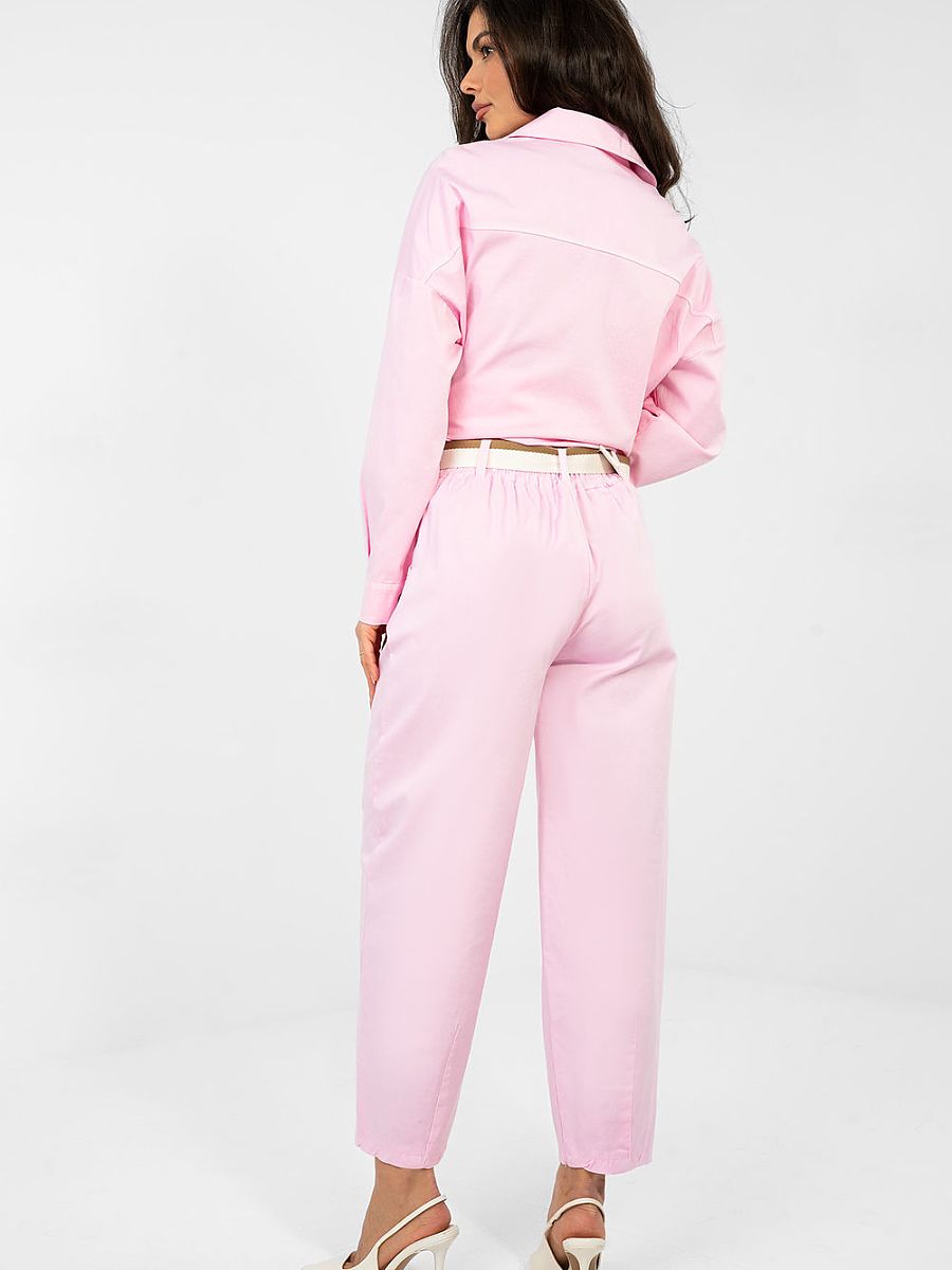 Comfortable and stylish carrot-cut trousers, perfect for everyday, casual stylizations. Made of high-quality cotton with elastane, which ensures comfort and lightness of wearing and subtle elasticity. The trousers have a high waist, tapered legs reaching 7/8 length, giving them a modern character. There is an elastic band in the waist, and additionally the trousers are equipped with a belt with a buckle, allowing for a perfect fit. Practical side pockets increase functionality, and a smooth pattern makes it easy to combine them with various wardrobe elements. These trousers are an excellent choice for those who appreciate comfort, freedom of movement, and a modern casual look.