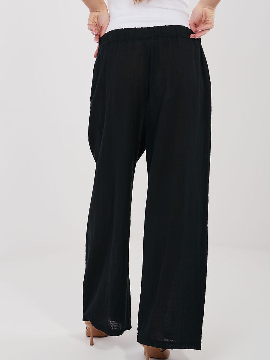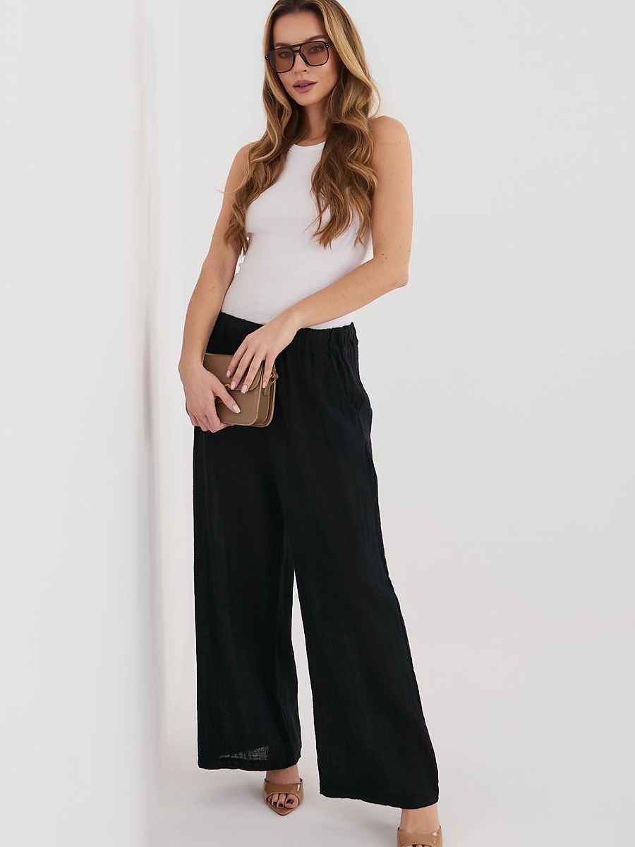 Stylish women’s wide leg trousers that combine comfort with a fashionable, casual style. The model has wide legs, which provide full freedom of movement and perfectly fit into current trends. The trousers are made of high-quality cotton, which is soft, breathable, and pleasant for the skin, making them ideal for everyday wear. The smooth pattern highlights their versatile character and makes it easy to match with many styles. The high-waisted model beautifully accentuates the waist, and the tie at the waist allows for a comfortable fit to the silhouette. An additional advantage are the practical side pockets, which increase the functionality of the trousers. This is an excellent choice for both casual and more elegant outfits.